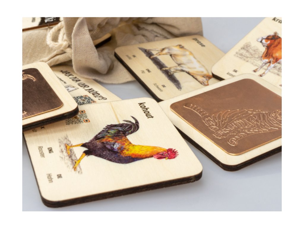 - Na každé kartě najdete věrnou ilustraci vybraného zvířete, QR kód, latinský název a také název ve slovenštině, němčině a angličtině.