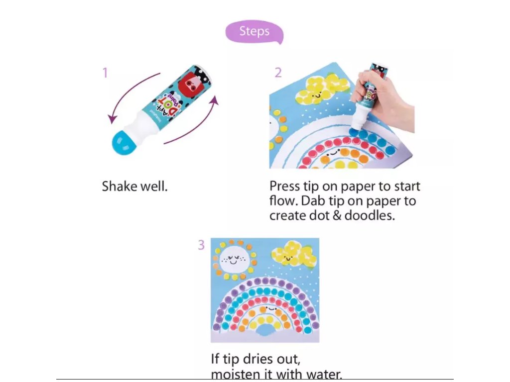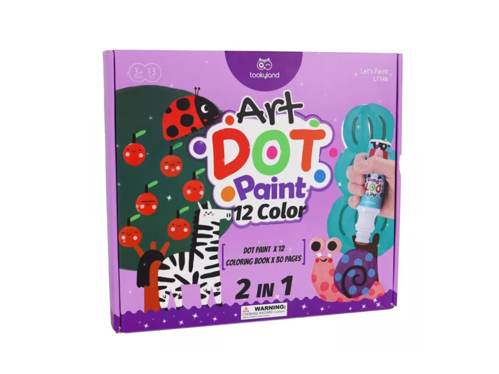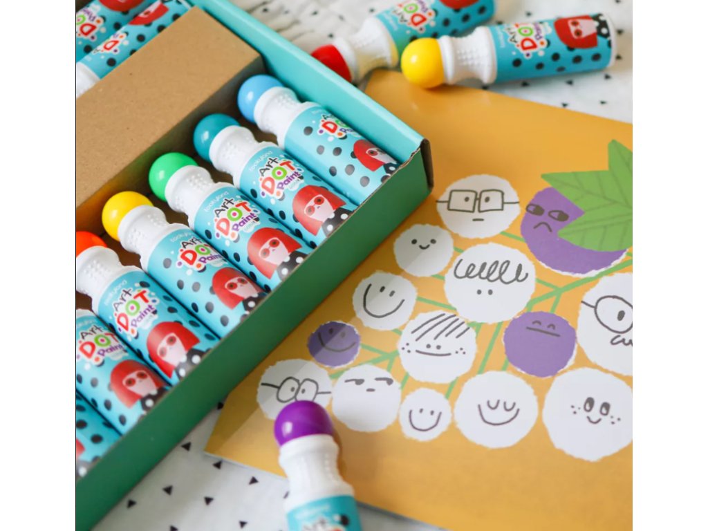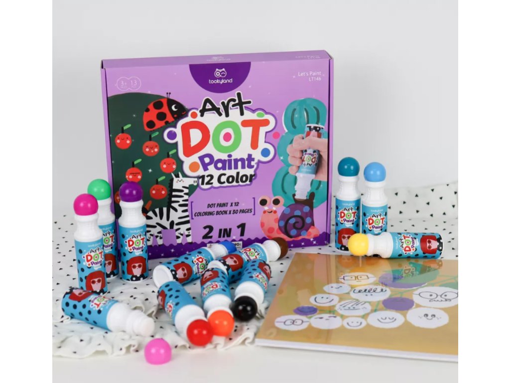 V tomto praktickém balení naleznete 12 základních barev ve snadno uchopitelných tubách pro malé ručičky a 30 stranami omalovánek na Dot Painting. Svěží barvy se budou dětem líbit. Barvy slouží pro jakékoli umělecké potřeby, vzdělávací hraní nebo jako umělecká zábava na párty pro děti. Jsou vytvořeny přímo pro děti, aby jim pomohly objevit a rozvinout své tvůrčí schopnosti a podpořit kreativní myšlení. Zabarvených prstů a oblečení se bát nemusíte, protože barvy jsou snadno vypratelné. Po použití na ně stačí nasadit víčka, aby barvy nevyschly.