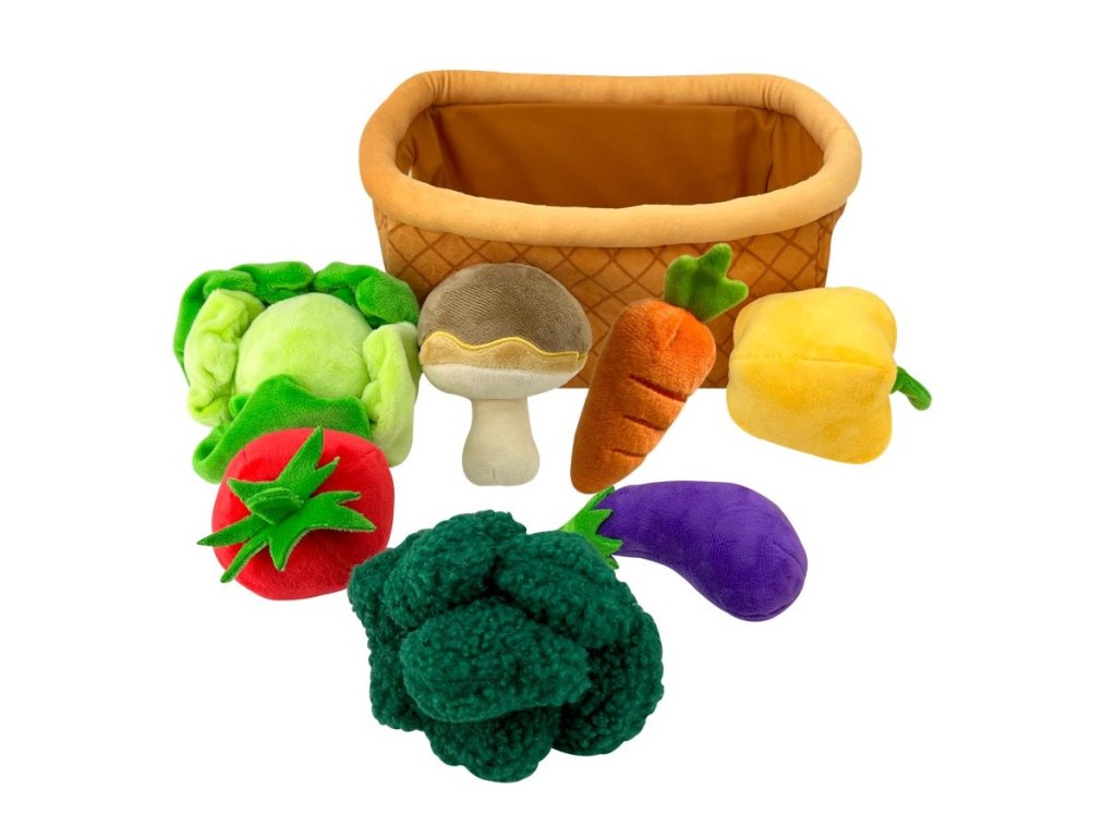 Plyšový košík se zeleninou a houbou je nezbytným doplňkem při hraní si na pěstování zeleniny, nebo její prodej v obchodě, ale najde také své využití i v dětské kuchyňce. Vyšívaná tematická plyšová hračka z velmi kvalitní plyše. Sada obsahuje košík, 6 imitací zeleniny a jedné houby: hlávkové zelí, mrkev, lilek, brokolice, rajče, paprika a houba. Použité materiály: Vrchní látka a výplň 100% polyester, vnitřní výztuže košíku - plast. Ruční praní a čištění vlhkým hadříkem. Vhodné pro děti od 2 let.