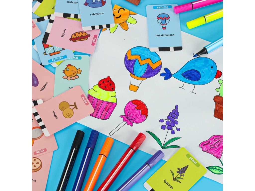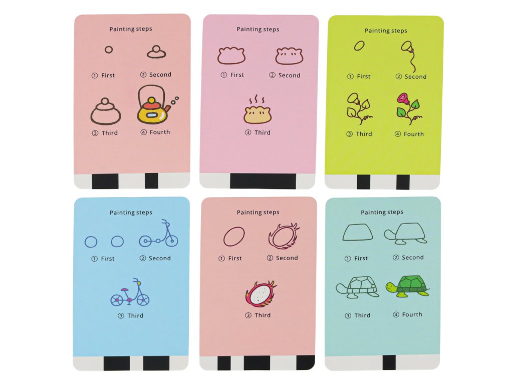 Díky přiloženým obrázkovým kartičkám a anglickým kartičkám se děti nejen učí kreslit, ale také si osvojují anglickou slovní zásobu – bez námahy, přirozeně a s radostí. Tato forma interaktivní hry je nejen efektivní, ale i fascinující!